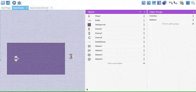 We will use object groups to control multiple meteor objects at once, especially in the events. Create a new object group called "Meteors" and add the meteor objects.